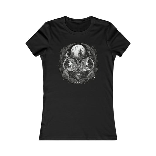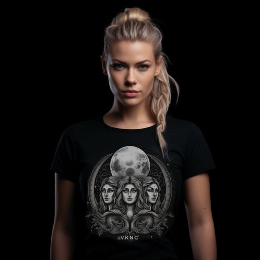Our Freyja t-short shows the goddess of love and beauty in her chariot drawn by two cats. She holds her spear, representing her status as a Valkyrie. She stands before a circle of Norse knotwork, which is related to natural magic. Freyja is a master of Seidr magic. Around her neck you can see a necklace, this is Brisingamen, the stunning gold necklace that she is rarely seen without.
