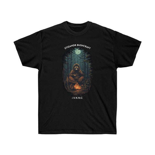 Our Odin the Wanderer t-shirt features the god in his guise as the wanderer, abandoning his seat at Asgard to explore the universe. He holds a walking staff and Yggdrasil, the world tree, reaches up behind him. Odin hung himself from Yggdrasil for nine days and nights pierced by his own spear to learn the secrets of the runes. The spear is visible in the background. Two ravens are also visible near the top of the image. These are Huginn (thought) and Muninn (memory), who would fly out into the world each day and tell the god everything that they saw.