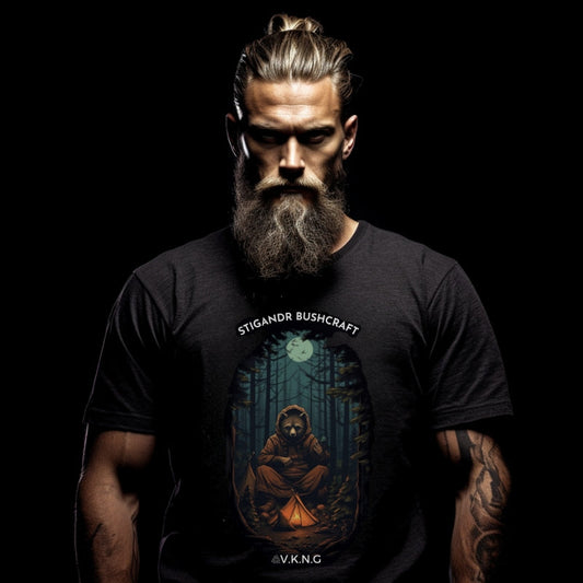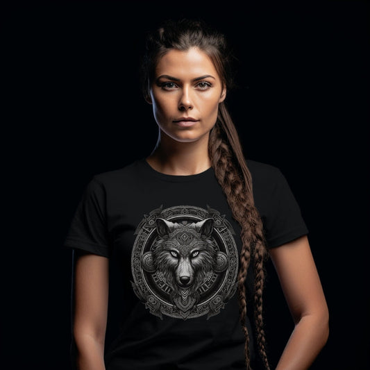 Our Fenrir and Tyr t-shirt shows the giant wolf as he approaches the god Tyr, a god of warrior and justice. Tyr will willingly put his hand in the wolf’s mouth to convince the wolf to let himself be chained up, even though he knows that he will lose his arm. The Tiwaz rune, sacred to Try, appears below the god in the design.
