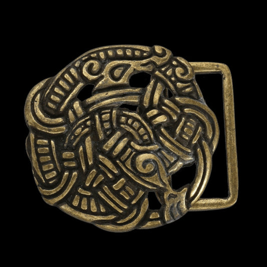 Our Ringerik Belt Buckle features a dragon or serpent in the Ringerike art style that was popular in Norway in the 10th century, the height of the Viking era. It represents a great serpent with its body twisting around itself to form an elaborate pattern. This is more or less the Viking equivalent of Celtic knotwork and a very popular motif in Viking art across the centuries.