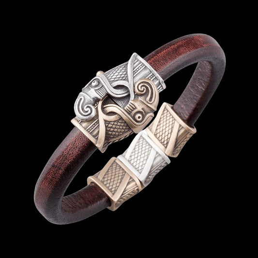 Handcrafted Valknut Odin's Spear Bronze Leather Bracelet