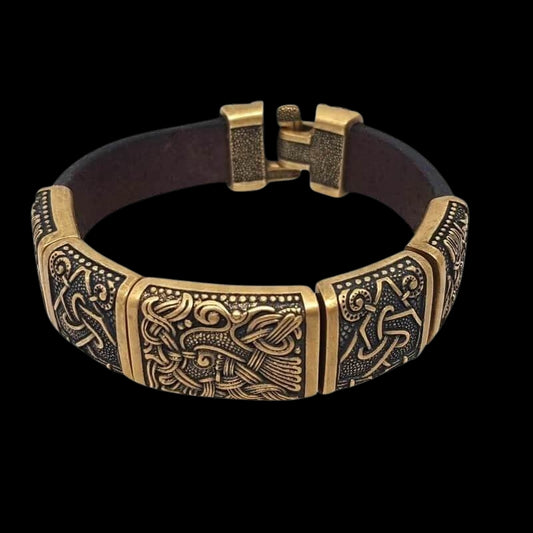 Handcrafted Valknut Odin's Spear Bronze Leather Bracelet