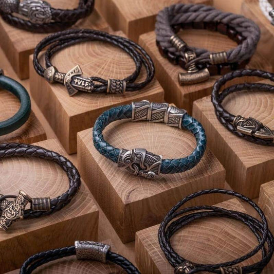 This is our collection of leather wrap-around bracelets and chunky leather “charm” bracelets for Vikings. Each features symbols from the Viking world.