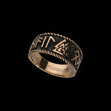 Zeigen Sie Ihre eigene Affinität zur Kriegermentalität der Wikinger mit diesem auffälligen Bronzering, der sowohl den Valknut als auch die Worte „Gegrüßet seist du Odin“ in originalen Wikinger-Runen des Jüngeren Futhark zeigt.