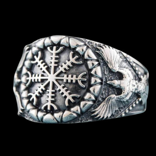 Handgefertigter Ring aus Sterlingsilber mit dem Symbol „Helm der Ehrfurcht“ und „Rabe“.