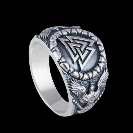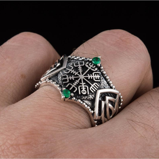Handgefertigter Silberring im Vegvisir-Symbol-Raben-Stil