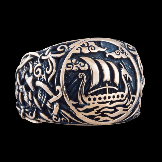 Wikingerringe mit Wikingerschiff - Die Wikinger waren nicht nur große Krieger, sondern auch Entdecker. Sie entdeckten Island und Grönland und segelten gut 500 Jahre vor ihren europäischen Nachbarn in die neue Welt. Die überlegene Technik ihrer Schiffe verschaffte ihnen auch jahrhundertelang einen kämpferischen Vorsprung gegenüber ihren Nachbarn. Das Langschiff repräsentiert den Wikinger als Krieger und Denker.