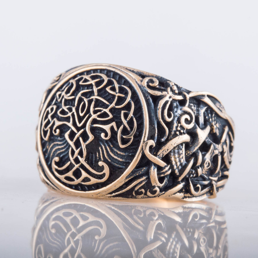 Handgefertigter Bronzering im Mammen-Stil mit Yggdrasil-Symbol
