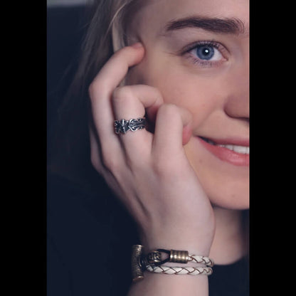 Eines Tages sah Odin, die Hauptgottheit der Wikinger, wie die Nornen, die nordischen Schicksale, mithilfe der Runen ihr Schicksal in die Rinde von Yggdrasil schrieben. Er begehrte ihre Macht und ihr Wissen und beschloss, es für sich zu gewinnen. Er erhängte sich neun Tage und neun Nächte lang am Weltenbaum Yggdrasil, während er von seinem eigenen Schwert durchbohrt wurde, bis ihm die Geheimnisse der Runen offenbart wurden. Als er die Runen lernte, teilte er sein Wissen mit der Menschheit. Die Männer, die sich mit den Runen am besten auskennen, werden Runenmeister genannt. Die Algiz-Rune war ein starkes Schutzsymbol und befindet sich in der Mitte dieses atemberaubenden Rings. Das Band verfügt über ein von Panzerungen inspiriertes Design. Das ist ideal für einen Wikinger-Krieger, da er besser als die meisten wusste, dass die beste Verteidigung ein guter Angriff ist.