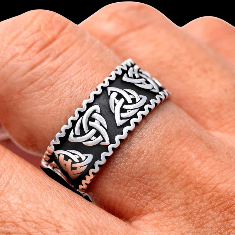 Dieser einzigartige Ring ist aus 925er Sterlingsilber gefertigt und zeigt den Triquetra-Knoten im Banddesign. Es ist ein starkes Symbol der keltischen Tradition für diejenigen, die den Geist der keltischen Kultur mit sich tragen möchten.