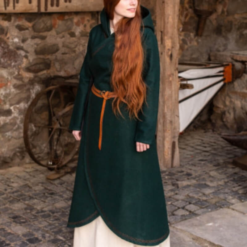 Inspiriert von den fließenden, schützenden Schichten, die während der Wikingerzeit getragen wurden, bietet dieser Wollfilz-Wickelmantel unvergleichliche Wärme und Stil für moderne Schildmädchen.