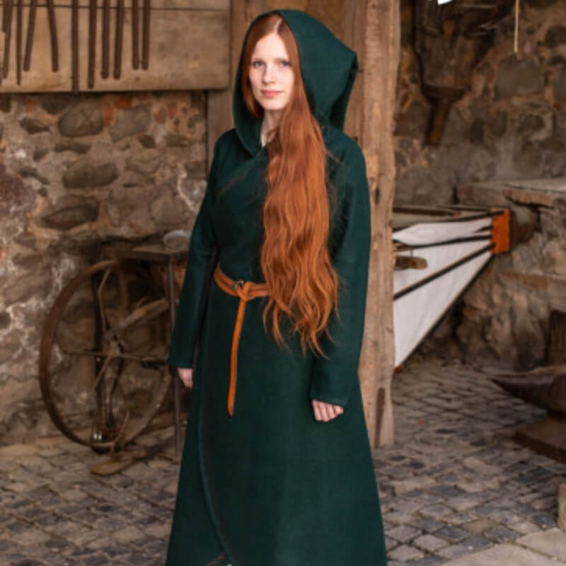 Der V-Ausschnitt und die aufwendige Stickerei verleihen einen Hauch von verfeinerter Kunstfertigkeit, während die lange Kapuze eine geheimnisvolle und historische Atmosphäre hinzufügt.