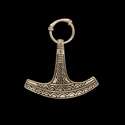 Dieser fein gearbeitete Bronzeanhänger ist eine Nachbildung eines Artefakts aus dem 9. Jahrhundert, das in Ylipää/Lieto, Finnland, gefunden wurde und den intensiven kulturellen Austausch zwischen den Finnen und den Wikingern veranschaulicht. Wie Thors Mjolnir diente Ukkos Axt als starkes Schutzamulett und wurde wegen seiner göttlichen Verbindung verehrt.