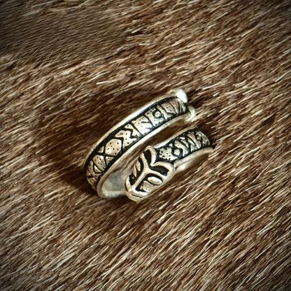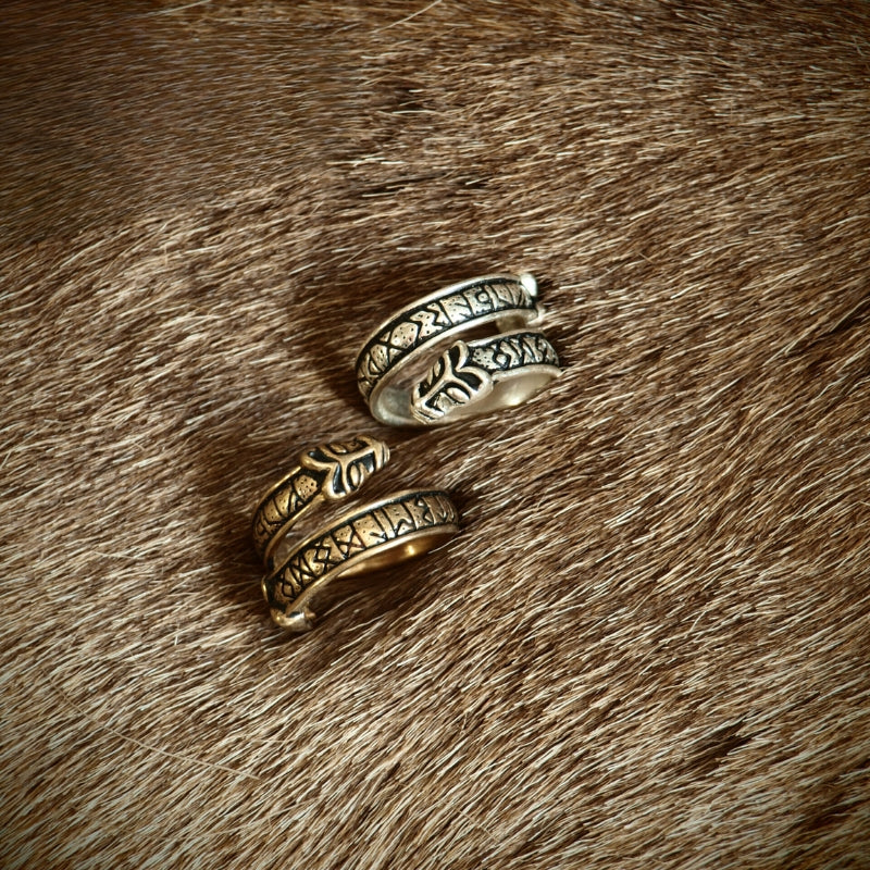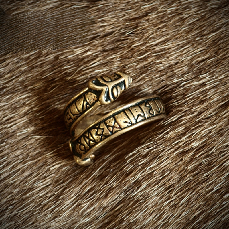 Die Runeninschrift entlang des Bandes verbindet den Ring zusätzlich mit den alten Traditionen der Wikinger. Runen waren mehr als nur Buchstaben; Sie hatten eine tiefe magische Bedeutung und wurden oft in Amuletten und Amuletten zum Schutz und zur Führung verwendet.