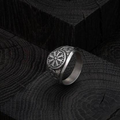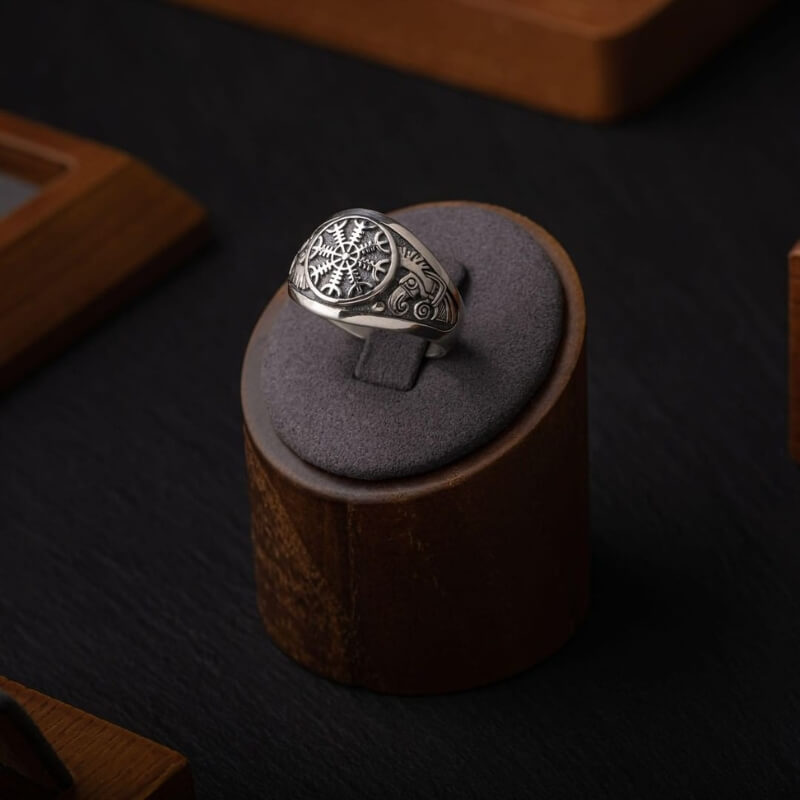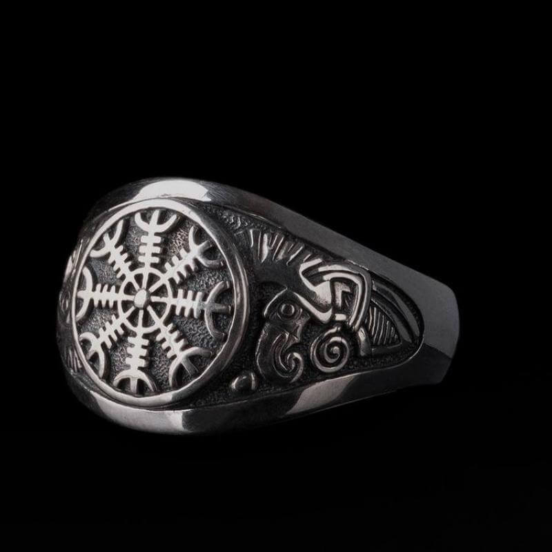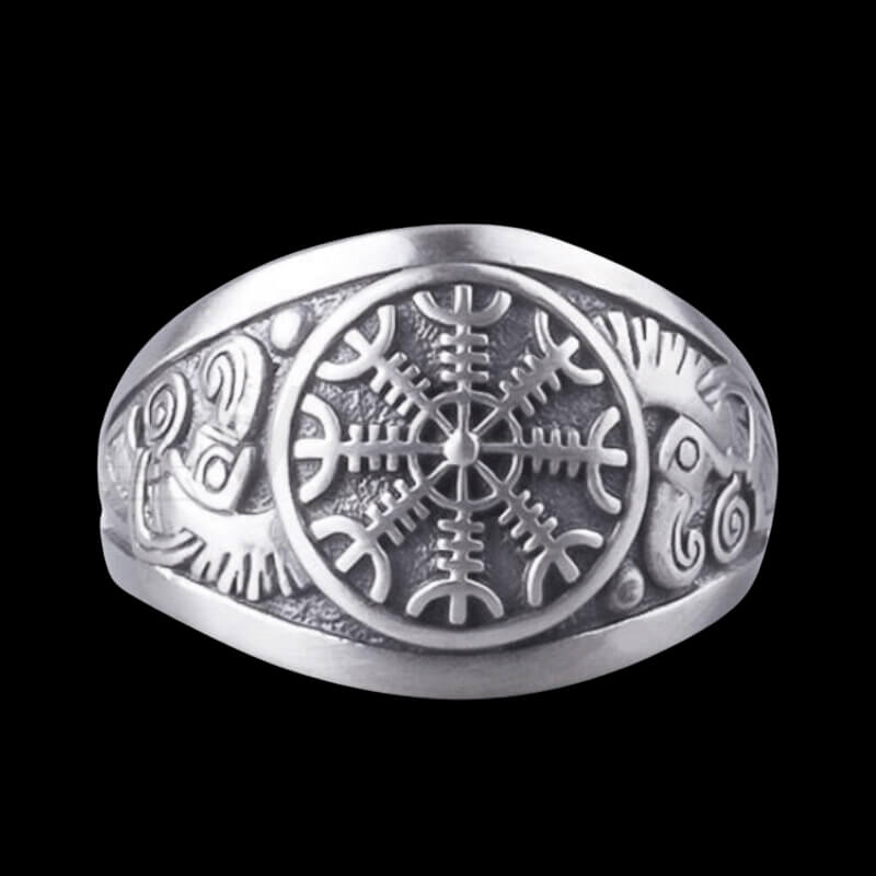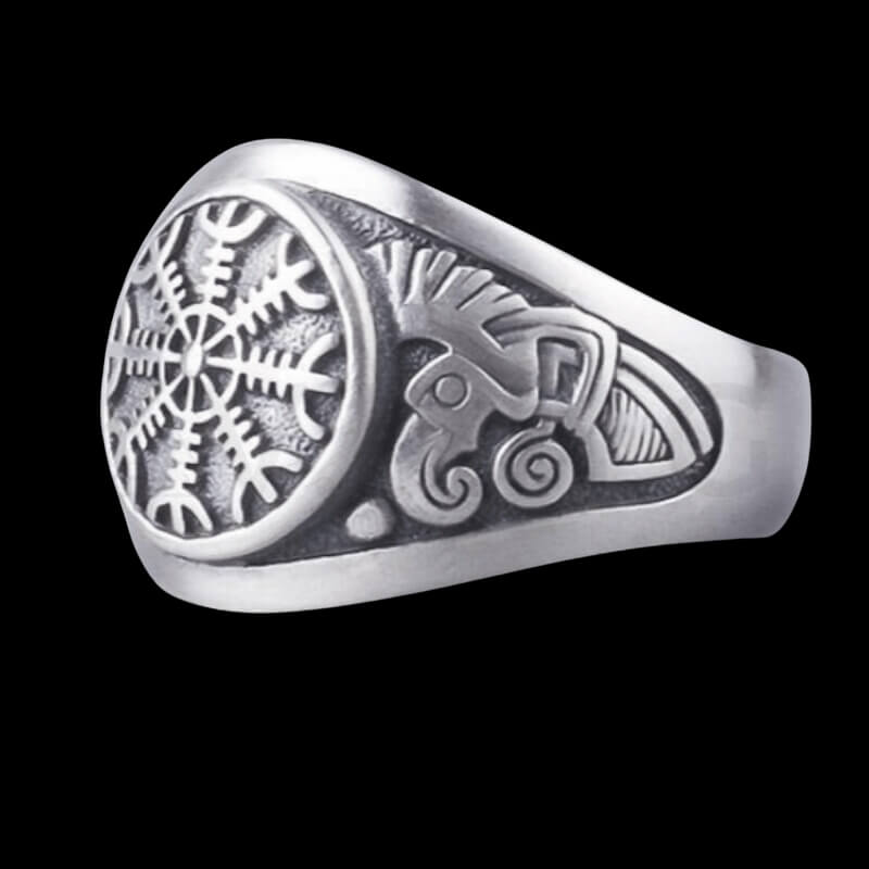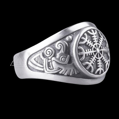 Handgefertigter silberner Wikingerring „Helm des Terrors“.