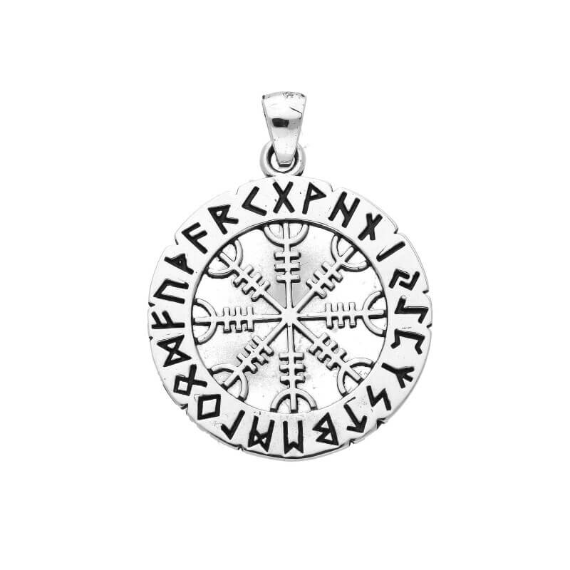 Dieser auffällige, herausragende Anhänger stellt dieses schützende magische Symbol in den Mittelpunkt. Als Hommage an ihre Macht wird es dann vom Runenalphabet der Wikinger umgeben.