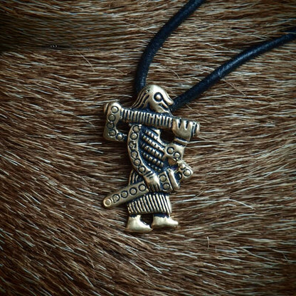 Das Kriegeramulett stellt einen mächtigen Krieger der Wikingerzeit dar, gekleidet in luxuriöse Gewänder und bewaffnet mit einem Schwert und einer bärtigen Kriegsaxt. Dieses Bild basiert auf dem Amulett, das an der archäologischen Stätte in Klahammar, Selaön, Södermanland, Schweden, aus dem 8.–10. Jahrhundert gefunden wurde.