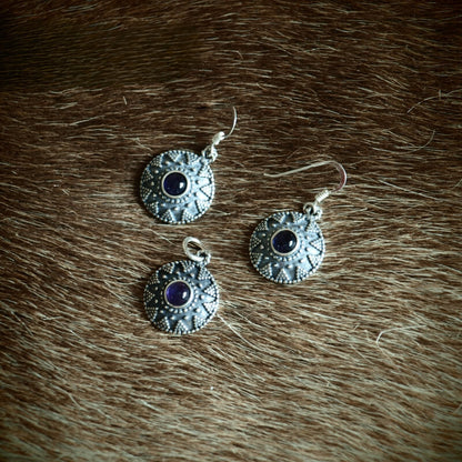 Dieses Set aus Ohrringen und Anhänger ist von diesem Ring inspiriert und fängt dessen Essenz und Schönheit ein. Das mit Präzision aus Sterlingsilber gefertigte Set wird durch einen faszinierenden natürlichen Amethyst zusätzlich veredelt und verleiht ihm einen Hauch von Eleganz und Luxus.