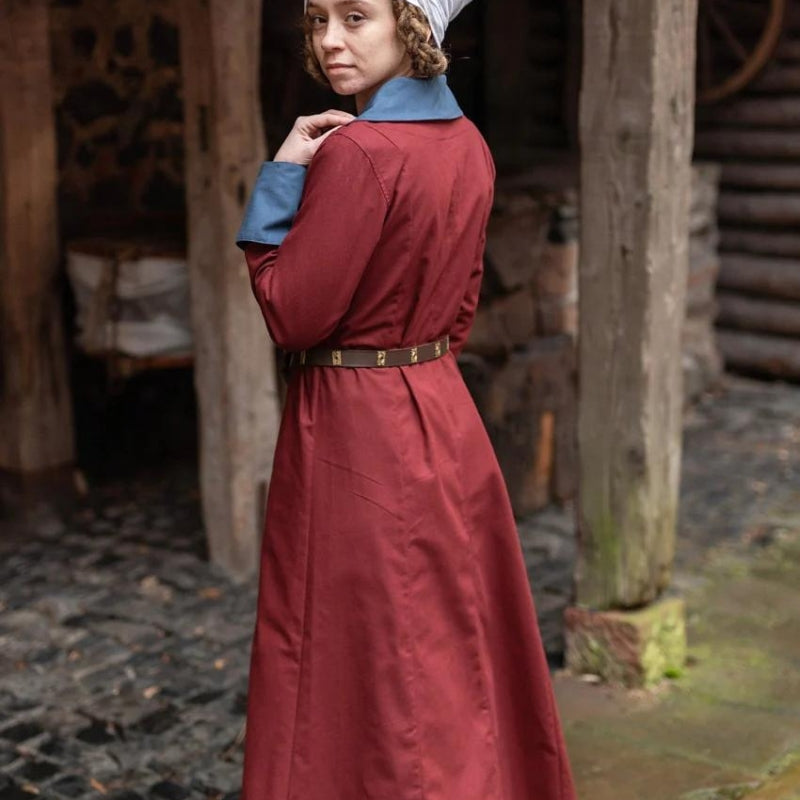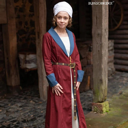 Das Tragen dieses Kleides bedeutet, einen zeitlosen Stil anzunehmen und gleichzeitig der nordischen Geschichte und Mythologie zu huldigen. Jedes Detail, von den Knöpfen unter dem Kragen bis hin zur Farbe Bordeaux/Woad Blue, ist darauf ausgelegt, einen authentischen Look zu bieten und gleichzeitig modernen Komfort zu gewährleisten.