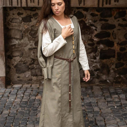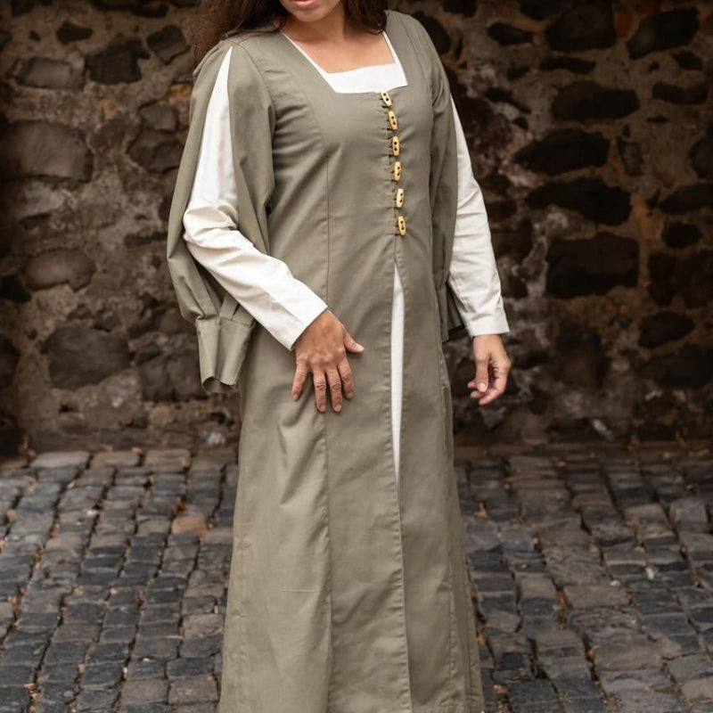 Dieses Kleid erinnert an Geschichten aus Sagen, in denen Frauen stolz und edel waren und selbst in den turbulentesten Zeiten einen Hauch von Raffinesse verliehen. Mit seinen geschlitzten Ärmeln mit Manschetten und dem quadratischen Ausschnitt erinnert das Überkleid „Verena“ an die Kleidungsstile, die in den großen Wikingerhallen zu sehen waren.