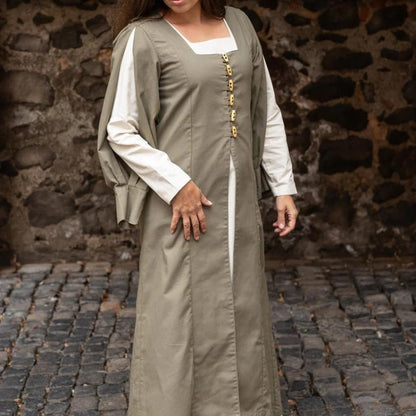 Das Tragen dieses Kleides bedeutet, einen zeitlosen Stil anzunehmen und gleichzeitig der nordischen Geschichte und Mythologie zu huldigen. Jedes Detail, von den sechs Knöpfen unterhalb des Ausschnitts bis zur Farbe „Seaweed“, ist darauf ausgelegt, einen authentischen Look zu bieten und gleichzeitig modernen Komfort zu gewährleisten.