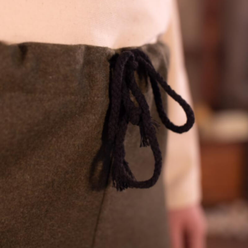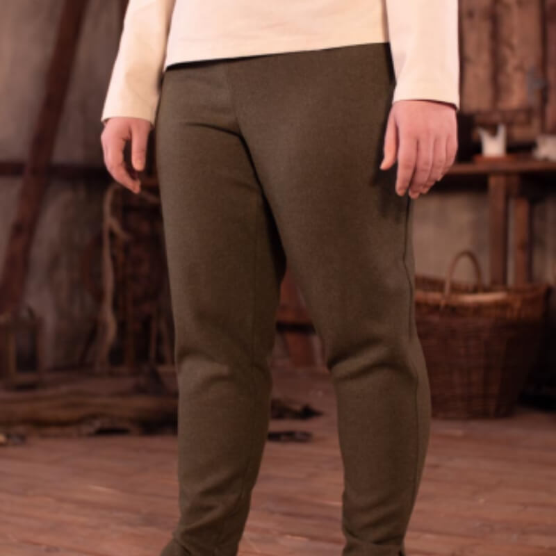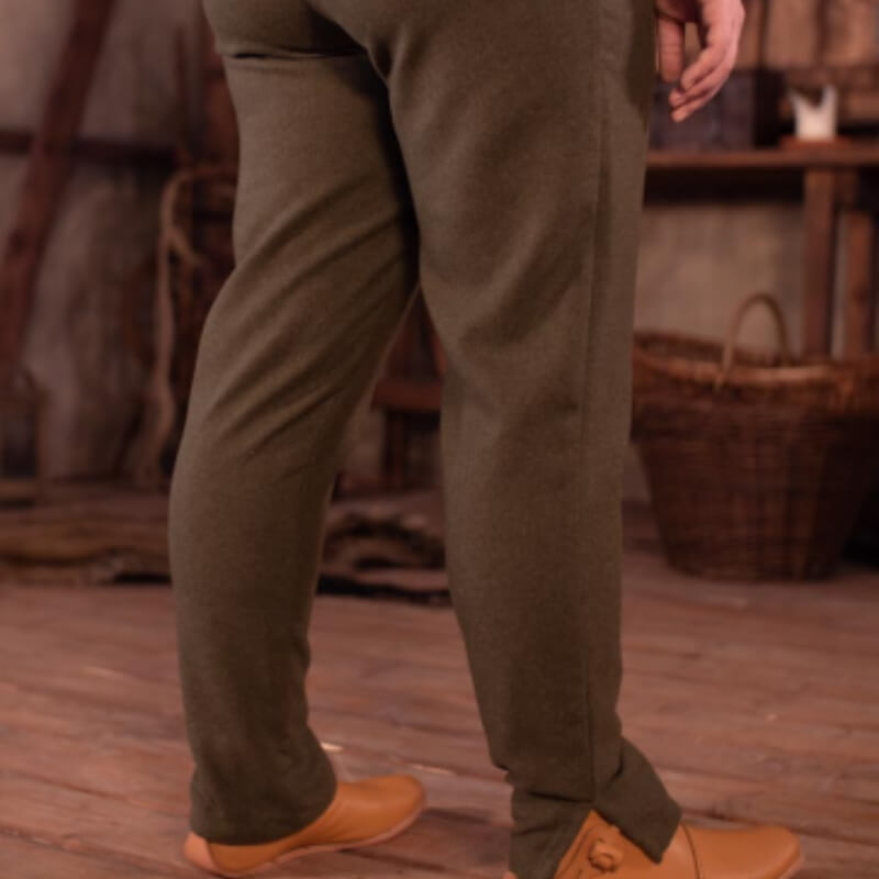 Hergestellt aus einem strapazierfähigen Wollmischgewebe bieten sie Wärme und Widerstandsfähigkeit, perfekt für lange Stunden im Freien oder kühle Festivalabende. Der olivgrüne Farbton verleiht einen natürlichen, erdigen Ton, der nahtlos in mittelalterliche und fantastische Umgebungen passt. Der verstellbare Kordelzug und der Riemenverschluss sorgen für eine enge Passform, sodass ein Gürtel nicht erforderlich ist.