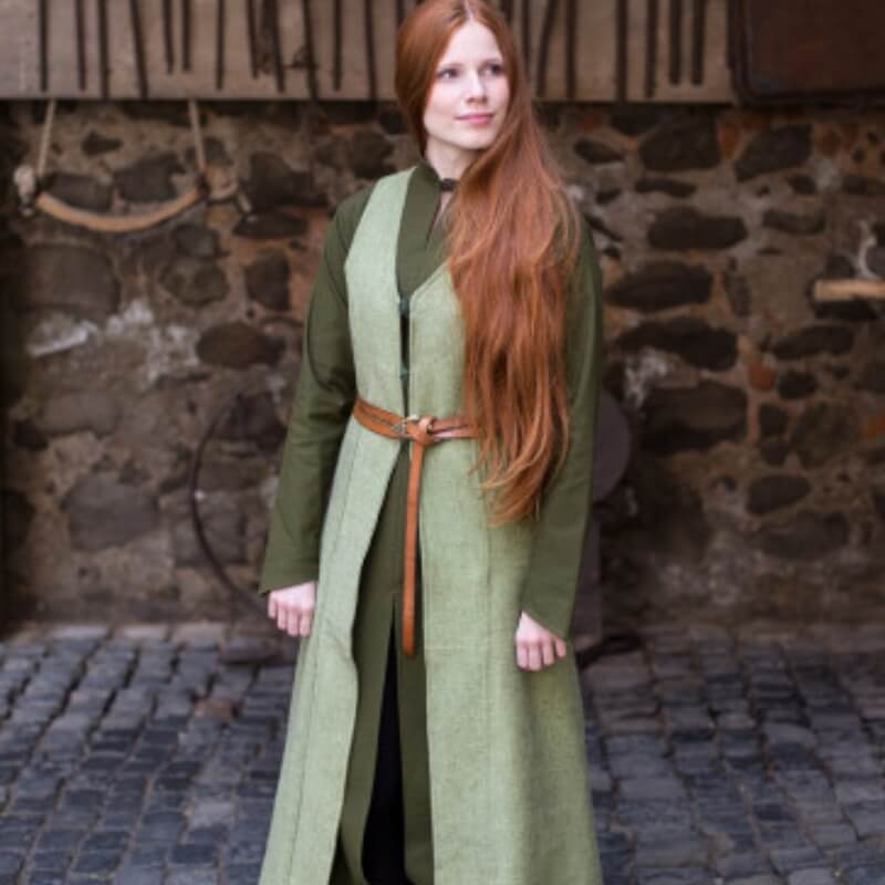 Der ärmellose Mantel Maiva ist ein atemberaubendes Beispiel für von der mittelalterlichen Mode inspirierte Kleidung, die darauf ausgelegt ist, eine Vielzahl von Figuren zu ergänzen. Diese elegante lange Weste, hergestellt aus schwerem Baumwollstoff, hat eine leicht ausgestellte Form, die mit jedem Schritt einen sanften und fließenden Schwung erzeugt.