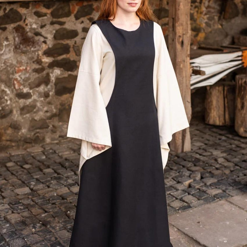 Die Surcot Isabella, oft als Teufelsfenster oder Höllentor bezeichnet, ist ein unverwechselbares mittelalterlich inspiriertes Kleidungsstück. Seine extrem weiten Armausschnitte sollen die Eleganz des darunter liegenden Unterwäschestücks hervorheben und seine Länge und sein fließendes Design zur Geltung bringen.