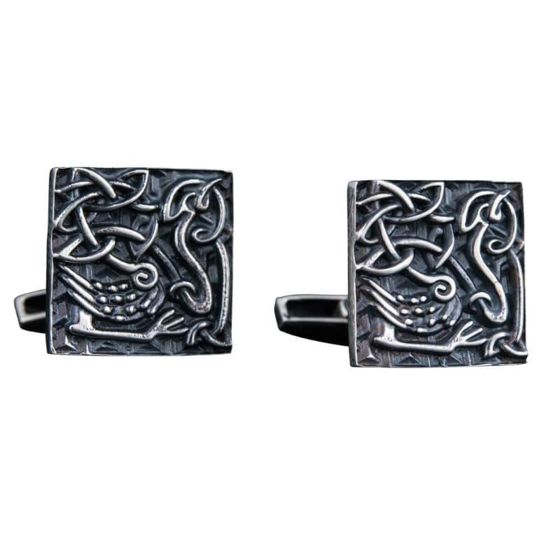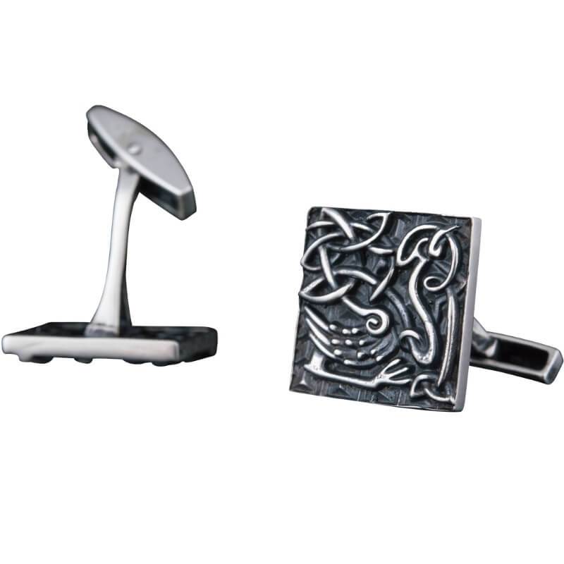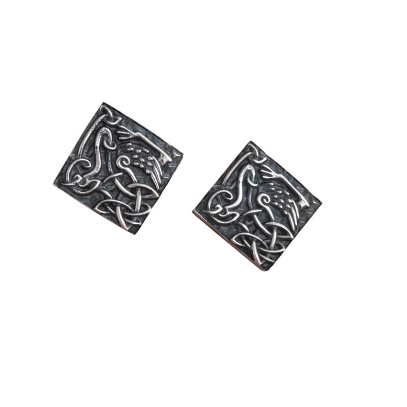 Der Urnes-Stil, der für seine komplizierten, wirbelnden Muster bekannt ist, blühte in der Wikingerkultur in der zweiten Hälfte des 11. Jahrhunderts auf. Diese Manschettenknöpfe werden in derselben Tradition gefertigt und bieten Ihnen ein Stück Wikingergeschichte, das Sie auch heute noch tragen können. Wenn Sie genau hinschauen, werden Sie das Symbol eines Raben bemerken, das in den wirbelnden Mustern versteckt ist. Der Rabe ist Odin, dem Allvater, heilig und symbolisiert seine Weisheit, Intelligenz und weitsichtige Vision.