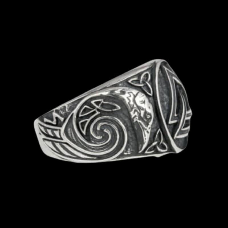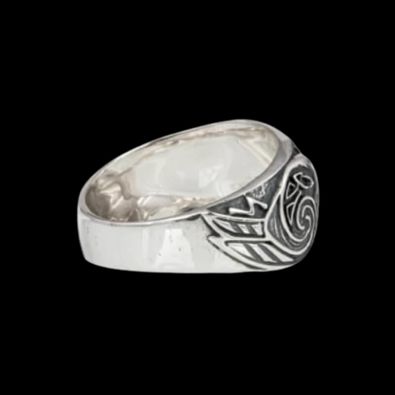 Flankiert von den verehrten Raben Huginn und Muninn, Symbolen des Denkens und der Erinnerung, verkörpert dieser Ring nicht nur die physischen Eigenschaften dieser Kreaturen, sondern auch ihre spirituelle Bedeutung. Es wurde angenommen, dass die Anwesenheit von Raben auf dem Schlachtfeld ein Zeichen der Gunst Odins war und den Weg des Kriegers nach Walhalla ankündigte.