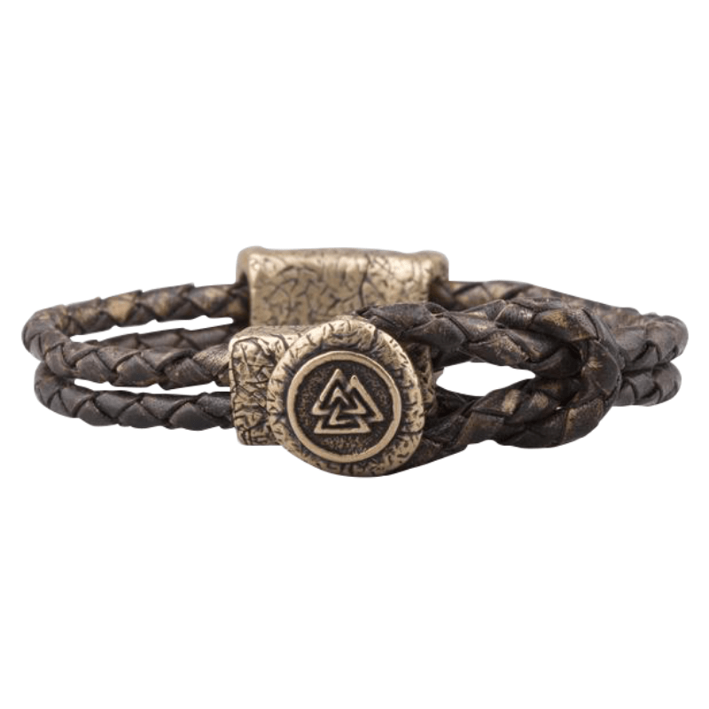 Das Valknut-Lederarmband mit Verschluss in Bronze ist eine kraftvolle Hommage an das ultimative Ziel des Wikingerkriegers: im Kampf zu sterben und sich einen Platz in Walhalla an der Seite der Götter zu verdienen. Das Valknut-Symbol, dargestellt durch drei ineinandergreifende Dreiecke, ist eng mit den Toten und Odin, dem verehrten König der nordischen Götter, verbunden.
