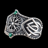 Verziert mit authentischen Designmerkmalen aus der nordischen Wikingerzeit und hervorgehoben durch zwei grüne Zirkonia, ist dieser Ring nicht nur ein Accessoire. Es ist ein Wächter, ein Führer und ein Symbol für die unbekannten Wege, die wir alle auf der Suche nach unserem Schicksal beschreiten. Lassen Sie es Ihr Kompass sein, der Sie mit der Weisheit der Alten führt.