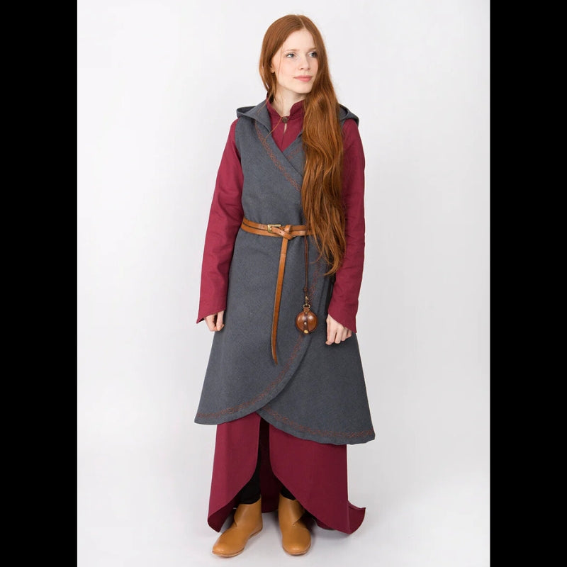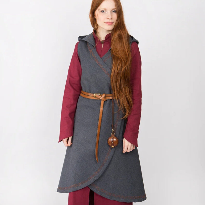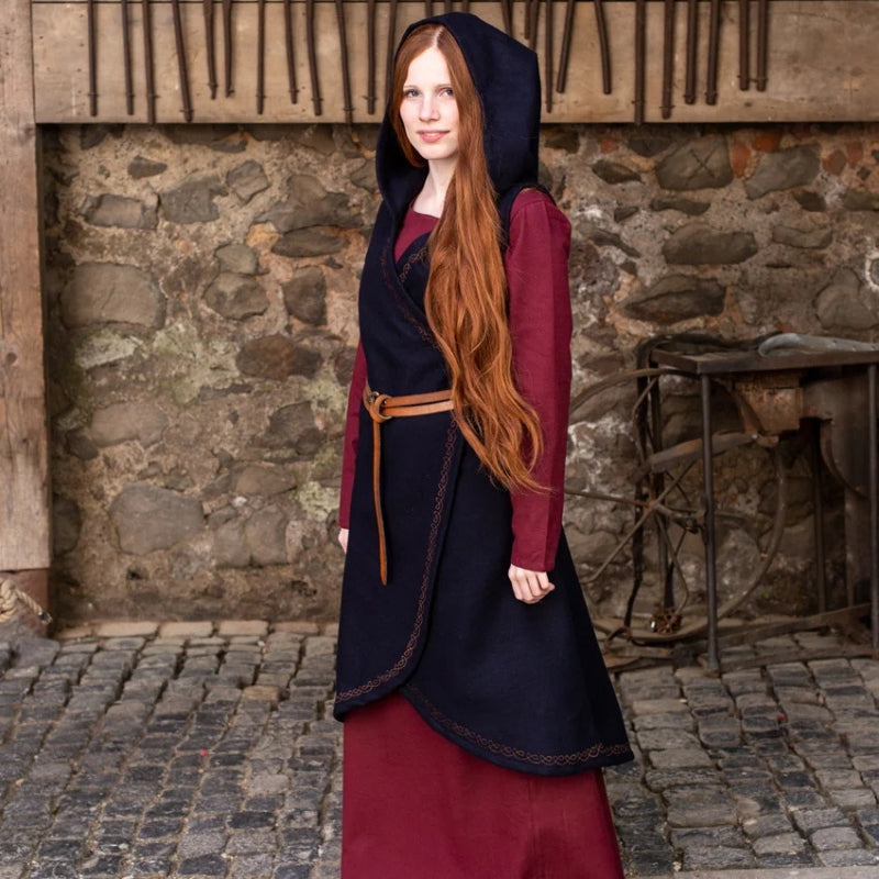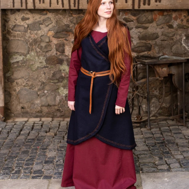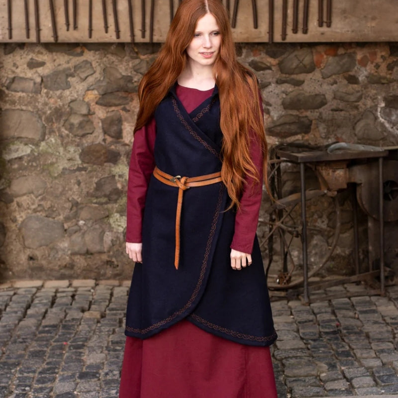 Tauchen Sie ein in die wilde Schönheit der nordischen Winter mit dem Wickelkleid Myrana. Dieses aus warmem Wollfilz gefertigte Kleid bietet unübertroffenen Komfort und Widerstandsfähigkeit und spiegelt den beständigen Geist der Wikingerfrauen wider, die den Elementen mit Kraft und Anmut trotzten. Die Stickerei an den Rändern vermittelt einen Hauch von Raffinesse und erinnert an alte nordische Kunst.