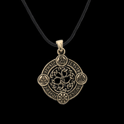 Dieser kunstvoll gestaltete bronzene Anhänger fängt das Wesen von Yggdrasil ein, umgeben von einem Kreis aus Runen, mit den Himmelsrichtungen geschmückt mit kraftvollen Wikinger-Symbolen, einschließlich des rätselhaften Valknut, einem Zeichen von Odins auserwählten Kriegern.
