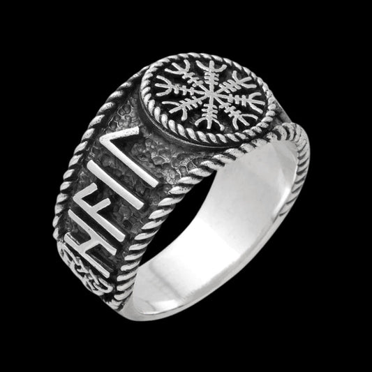 Handgefertigter Ring aus Sterlingsilber mit Symbol „Helm der Ehrfurcht“ und nordischem Ornament