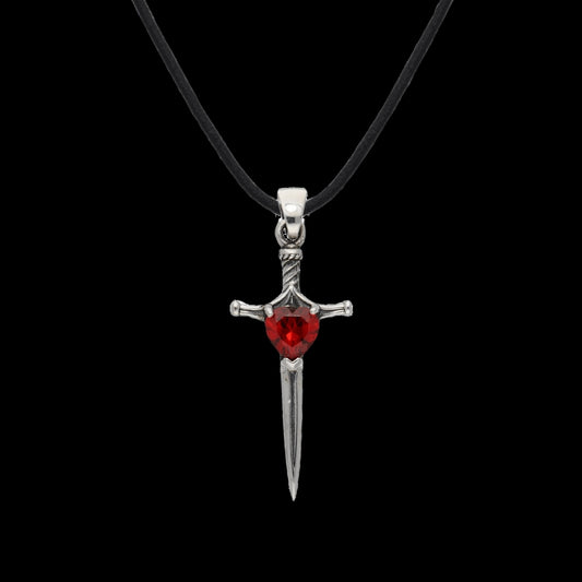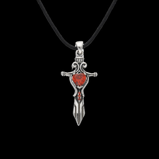 Handgefertigter Stiletto-Schwert-Anhänger aus rotem Zirkonia-Sterlingsilber