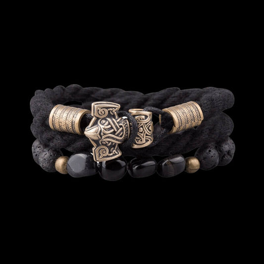 Handgefertigtes bronzefarbenes Raben-Mjolnir-Lavastein-Armband
