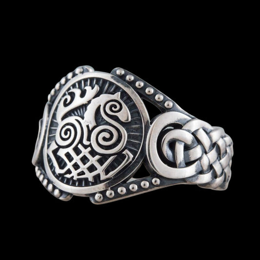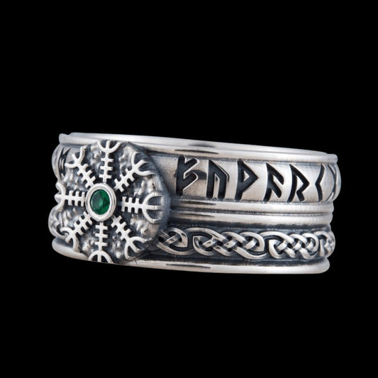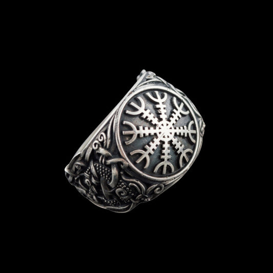 Handgefertigter Ring aus Sterlingsilber mit Symbol „Helm der Ehrfurcht“ und Wikingerornament