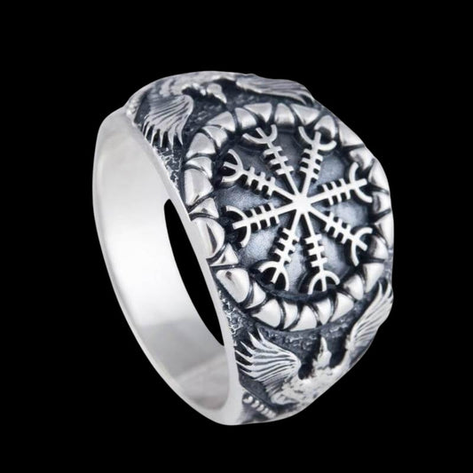 Handgefertigter Ring aus Sterlingsilber mit Vegvisir-Symbol und nordischem Ornament