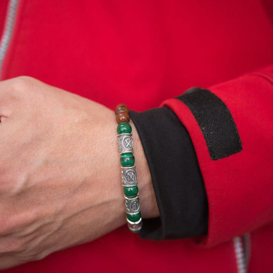 Viking Bracelet with Malachite and Red Obsidian, Engraved Runes of Odin