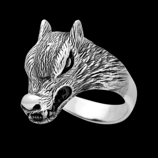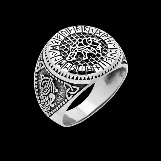 925 Sterling Silver Viking Wolf and Norse Runes Ring