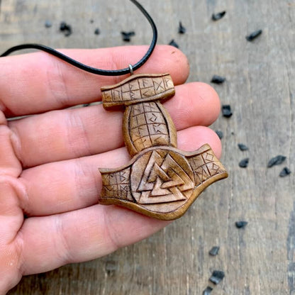 Handcarved Unique Wood Runic Mjolnir Valknut Pendant