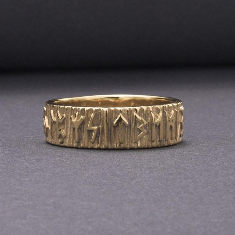 Invoke this powerful system of Viking magic for yourself with this stunning gold ring inscribed with the runes on a bark-style background, representing Yggdrasil as their source.