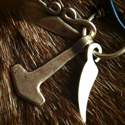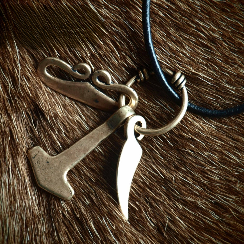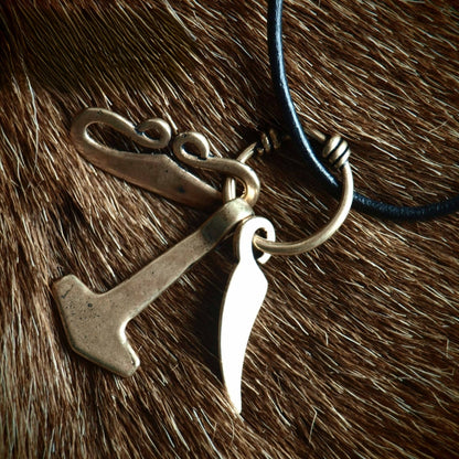 The three symbols on this amulet a sickle, a hammer, and a firesteel are believed to represent the god Thor, one of the most revered figures in Norse mythology. Each element carries its own meaning: the sickle for harvest and prosperity, Mjolnir (Thor's hammer) for protection, and the firesteel for the warmth and safety of the hearth.