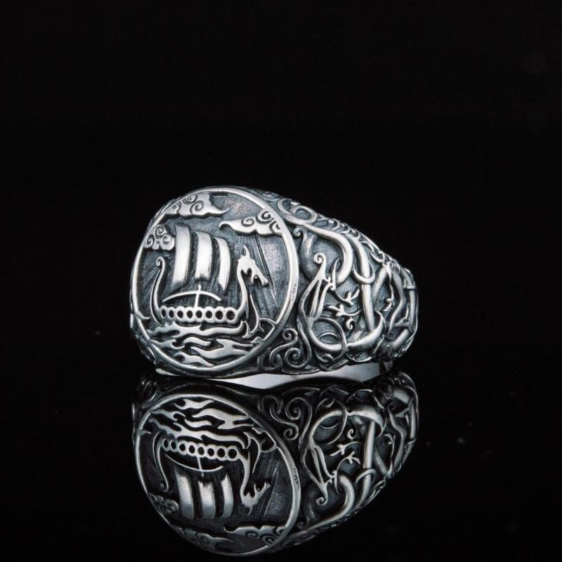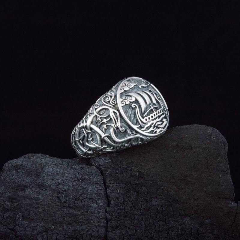 To make their ships even more terrifying, the Vikings would sometimes decorate them to look like dragons. It is one of these Drakkar ships that appears on this ring.
