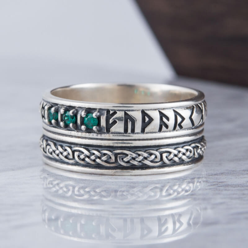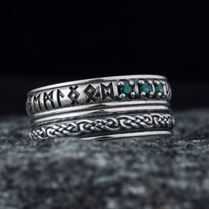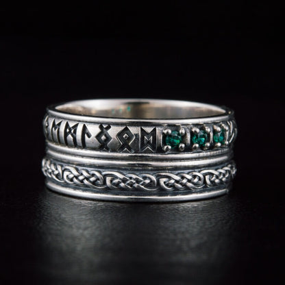 Crafted with care in Ukraine, this ring is not just a band of silver; it's a circle of ancient wisdom that encircles your finger. The cubic zirconia stones embedded within are like the sparkling eyes of the Norns, the fates of Norse lore, watching over the path of destiny.