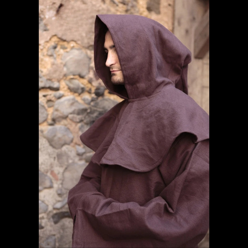 This set includes a cowl, matching gugel, and rope belt, ensuring an authentic historical look. The coarse cotton fabric offers a rustic aesthetic while remaining comfortable to wear.