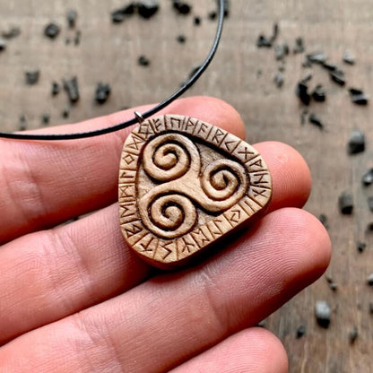 Handcarved Unique Walnut Wood Runes Triskelion Pendant