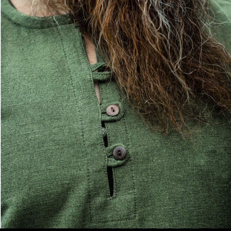 La abertura frontal no sólo añade estilo sino que también garantiza libertad de movimiento, lo que la convierte en una prenda funcional para cualquier recreador vikingo o entusiasta de la historia. El escote de cuatro botones aporta un toque de sofisticación al tiempo que garantiza un ajuste seguro y cómodo.