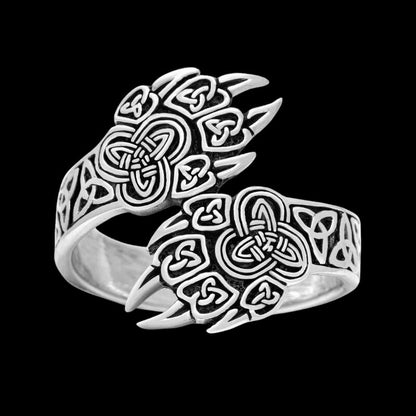 El oso, una criatura de asombro en la era vikinga, encarna la quintessencia del valor y la fuerza primitiva. Este anillo de plata esterlina captura la esencia de la garra del oso, un emblema de los legendarios berserkers que canalizaban la ferocidad del oso en la batalla.